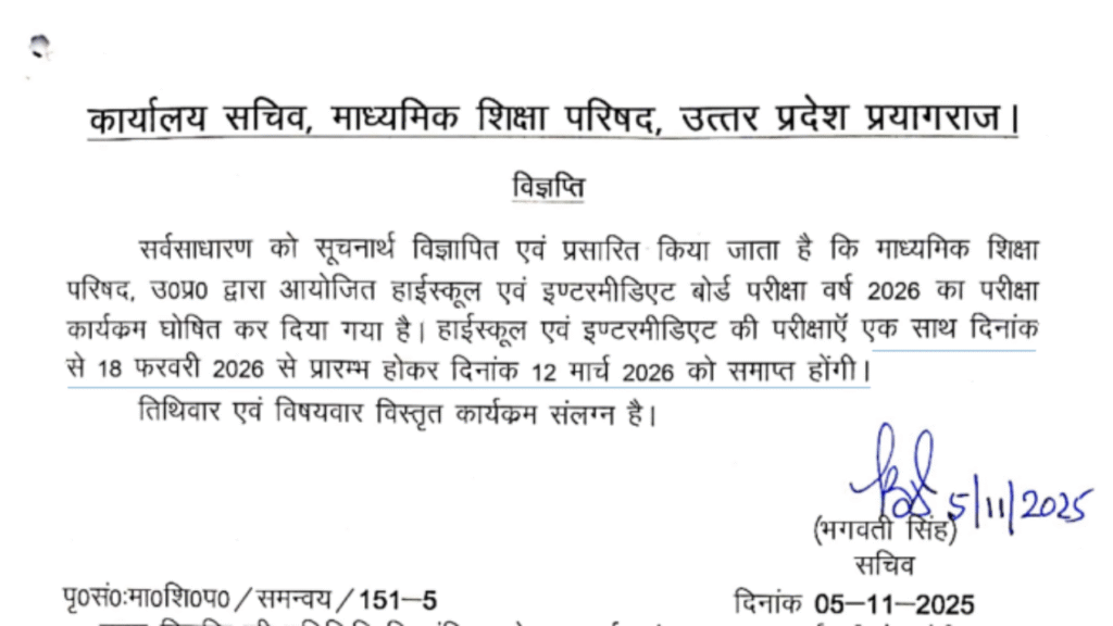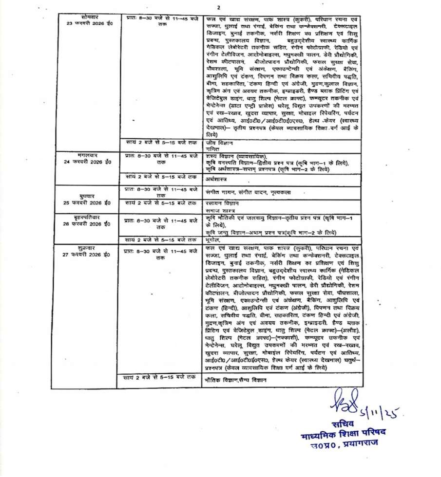 UP Board Exam Time Table 2026 – डेट शीट में दी गई जानकारी