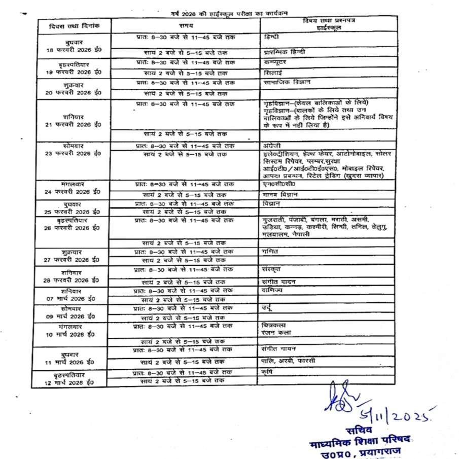 UP Board Exam Time Table 2026 : यूपी बोर्ड की 10वीं और 12वींकी परीक्षा की तैयारी कर रहे स्टूडेंट्सकेकी परीक्षा की तैयारी कर रहे स्टूडेंट्स के लिए बड़ी खबर हैं। इन परीक्षाओंके तारीखों का ऐलान हो चुका हैजानकारी के मुताबिक 10वीं और 12वीं की परीक्षायें एक साथ 18 फरवरी से शुरू होगी।