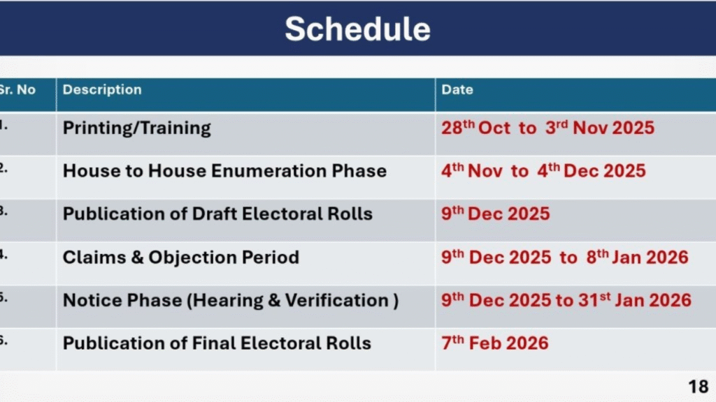 What Is SIR In Election In Hindi : मुख्य चुनाव आयुक्त ज्ञानेश कुमार ने कहा कि फिर की दूसरी पेज की प्रक्रिया शुरू हो गई है प्रिंटिंग और ट्रेनिंग का काम 28 अक्टूबर 2025 से 3 नवंबर 2025 तक चलेगा 4 नवंबर 2025 से 4 दिसंबर 2025 तक घर घर जाकर मतदाताओं की जानकारी जुटा जाएगी वहीं 9 दिसंबर 2025 को मतदाता सूची का ड्राफ्ट पेश किया जाएगा। आपत्ति 9 दिसंबर 2025 से 8 जनवरी 2026 तक कर सकते हैं तथा सुनवाई और सत्यापन 9 दिसंबर 2025 से 31 जनवरी 2026 तक होगी। और अंतिम मतदाता सूची 7 फरवरी 2026 को जारी कर दिया जाएगा।